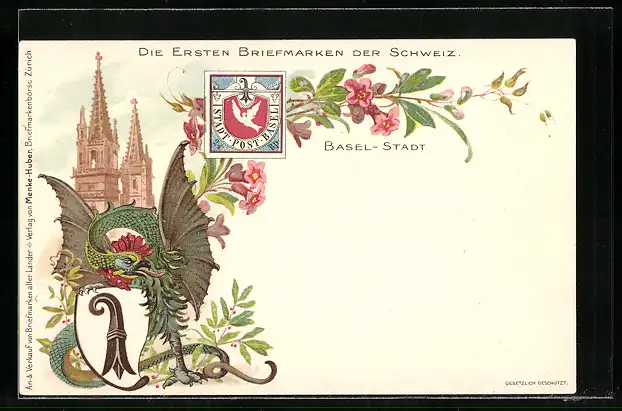 Lithographie Basel, Kirche, Drache und Wappen, Briefmarke Basel-Stadt, Private Stadtpost