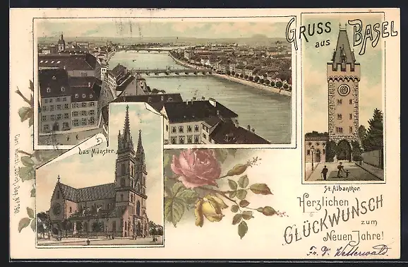 Lithographie Basel, Münster, St. Albanthor, Rheinpartie