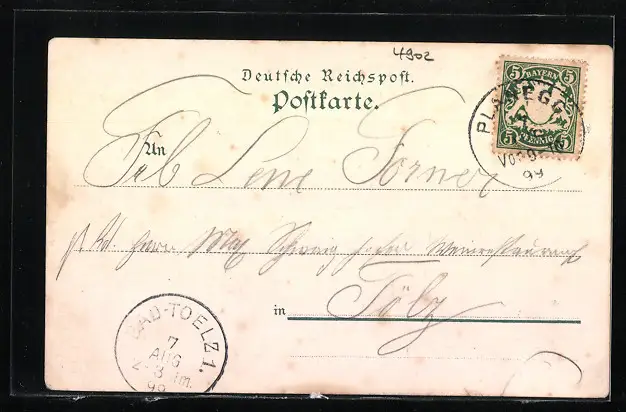 Personenbezogene Daten auf der Rückseite der Karte wurden durch blauen Textmarker unkenntlich gemacht. Die blauen Stellen sind auf die Vorderseite durchgeweicht und wirken sich negativ auf das Postkartenfoto aus