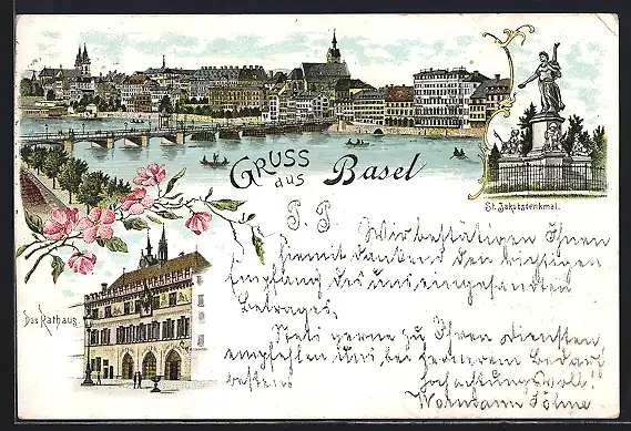 Lithographie Basel, Rathaus, St. Jakobsdenkmal, Totalansicht