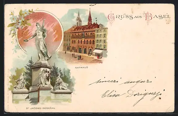 Lithographie Basel, Rathaus und Jacobs-Denkmal