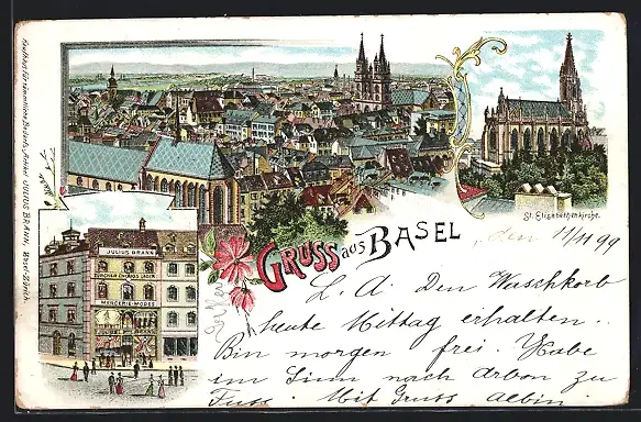 Lithographie Basel, St. Elisabethkirche, Geschäftshaus Julius Brann, Teilansicht über Kirchen und Häuser