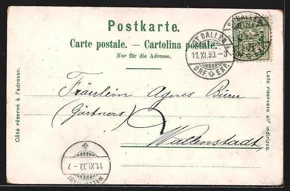 Personenbezogene Daten auf der Rückseite der Karte wurden durch blauen Textmarker unkenntlich gemacht. Die blauen Stellen sind auf die Vorderseite durchgeweicht und wirken sich negativ auf das Postkartenfoto aus