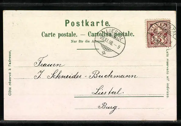 Personenbezogene Daten auf der Rückseite der Karte wurden durch blauen Textmarker unkenntlich gemacht. Die blauen Stellen sind auf die Vorderseite durchgeweicht und wirken sich negativ auf das Postkartenfoto aus