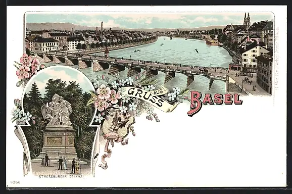 Lithographie Basel, Strassburger Denkmal, Flusspartie mit Brücke