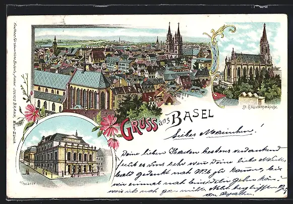 Lithographie Basel, Theater, St. Elisabethenkirche, Totalansicht