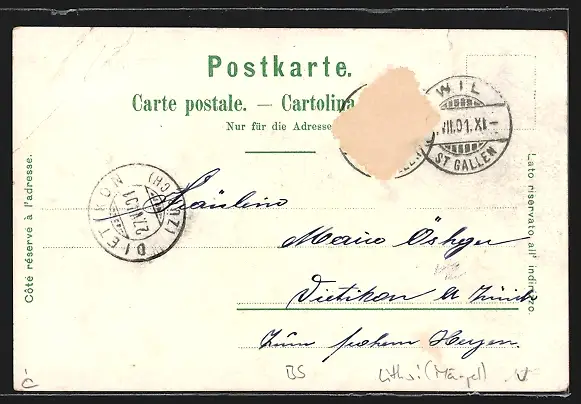 Personenbezogene Daten auf der Rückseite der Karte wurden durch blauen Textmarker unkenntlich gemacht. Die blauen Stellen sind auf die Vorderseite durchgeweicht und wirken sich negativ auf das Postkartenfoto aus