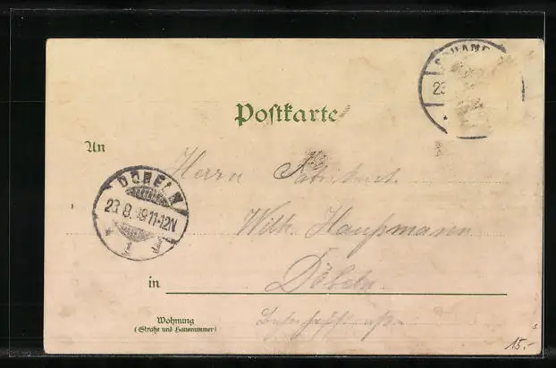 Personenbezogene Daten auf der Rückseite der Karte wurden durch blauen Textmarker unkenntlich gemacht. Die blauen Stellen sind auf die Vorderseite durchgeweicht und wirken sich negativ auf das Postkartenfoto aus