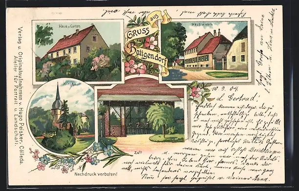 Lithographie Battgendorf, Kirche, Zelt, Haus v. Garten