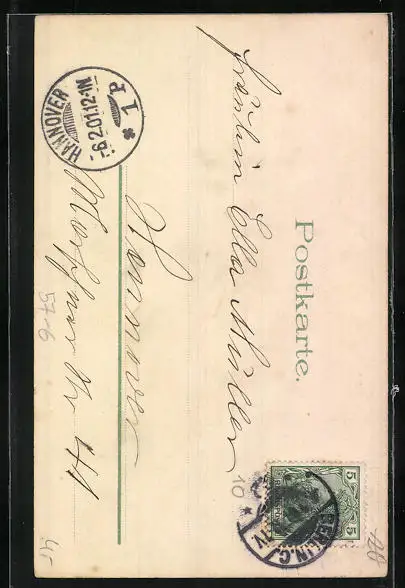 Personenbezogene Daten auf der Rückseite der Karte wurden durch blauen Textmarker unkenntlich gemacht. Die blauen Stellen sind auf die Vorderseite durchgeweicht und wirken sich negativ auf das Postkartenfoto aus
