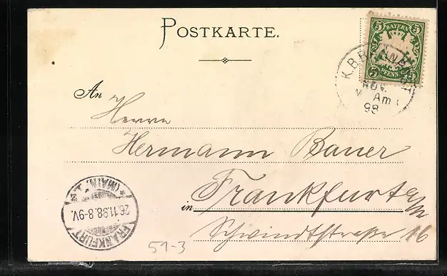 Personenbezogene Daten auf der Rückseite der Karte wurden durch blauen Textmarker unkenntlich gemacht. Die blauen Stellen sind auf die Vorderseite durchgeweicht und wirken sich negativ auf das Postkartenfoto aus