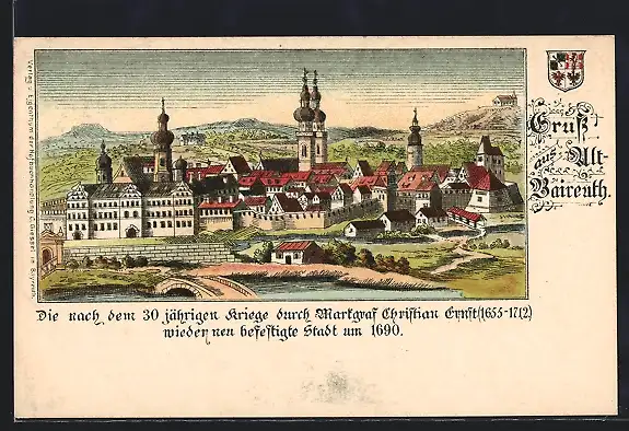 Lithographie Bayreuth, Blick auf die um 1690 neu befestigte Stadt