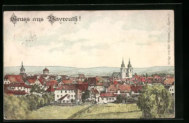 Lithographie Bayreuth, Gesamtansicht mit Kirche