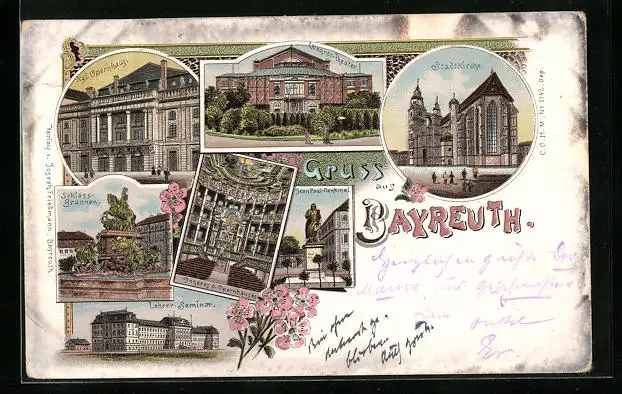 Lithographie Bayreuth, Stadtkirche, Wagner-Theater, Kgl. Opernhaus