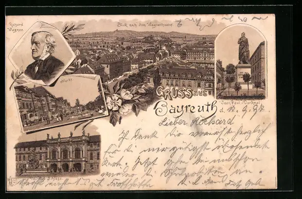 Lithographie Bayreuth, Teilansicht aus der Vogelschau, Richard Wagner, Markt