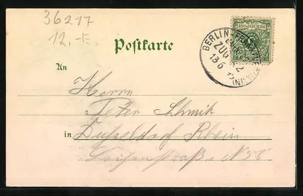 Personenbezogene Daten auf der Rückseite der Karte wurden durch blauen Textmarker unkenntlich gemacht. Die blauen Stellen sind auf die Vorderseite durchgeweicht und wirken sich negativ auf das Postkartenfoto aus