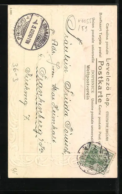 Personenbezogene Daten auf der Rückseite der Karte wurden durch blauen Textmarker unkenntlich gemacht. Die blauen Stellen sind auf die Vorderseite durchgeweicht und wirken sich negativ auf das Postkartenfoto aus