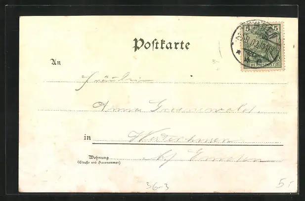 Personenbezogene Daten auf der Rückseite der Karte wurden durch blauen Textmarker unkenntlich gemacht. Die blauen Stellen sind auf die Vorderseite durchgeweicht und wirken sich negativ auf das Postkartenfoto aus