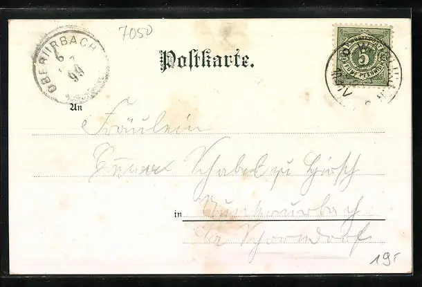 Personenbezogene Daten auf der Rückseite der Karte wurden durch blauen Textmarker unkenntlich gemacht. Die blauen Stellen sind auf die Vorderseite durchgeweicht und wirken sich negativ auf das Postkartenfoto aus