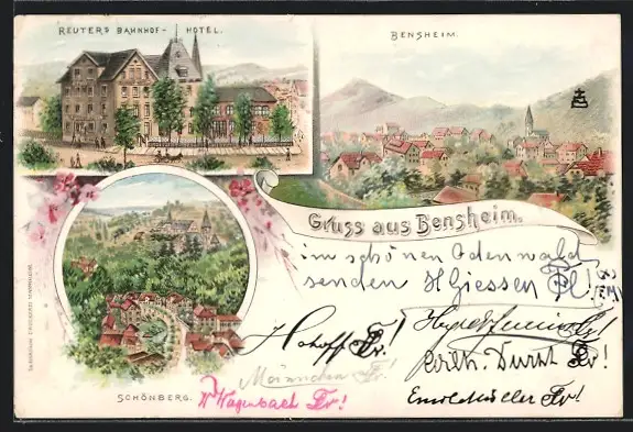 Lithographie Bensheim, Reuters Bahnhof-Hotel, Ortsansicht