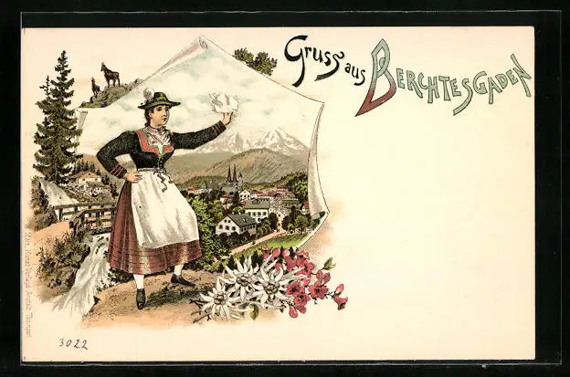Lithographie Berchtesgaden, Ortsansicht mit Mädchen in Tracht