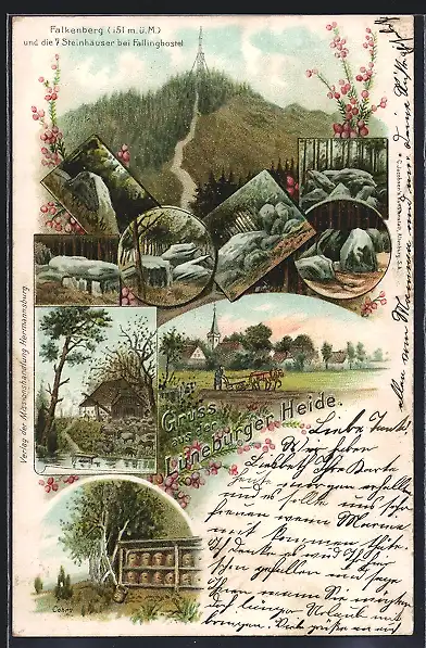 Lithographie Bergen / Lüneburger Heide, Imkerei, Falkenberg und die 7 Steinhäuser bei Fallingbostel