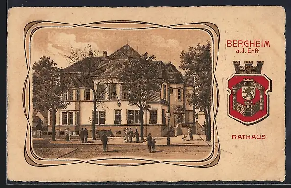 Lithographie Bergheim a. d. Erft, Blick auf das Rathaus, Passepartout mit Wappen