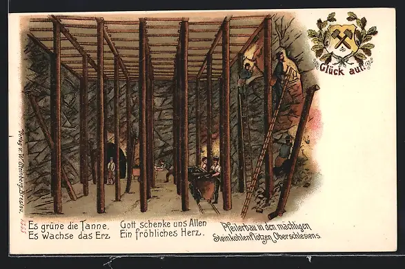 Lithographie Bergmänner beim Pfeilerbau in Steinkohlenflötzen Oberschlesiens