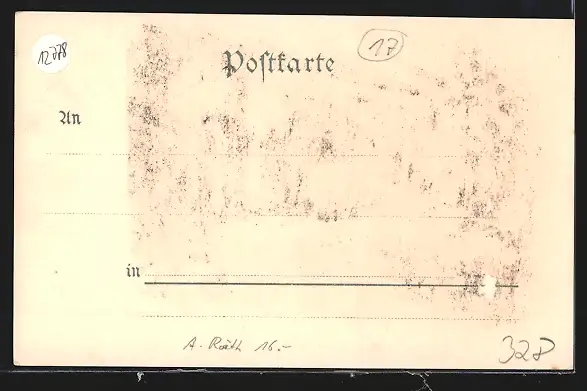 Personenbezogene Daten auf der Rückseite der Karte wurden durch blauen Textmarker unkenntlich gemacht. Die blauen Stellen sind auf die Vorderseite durchgeweicht und wirken sich negativ auf das Postkartenfoto aus