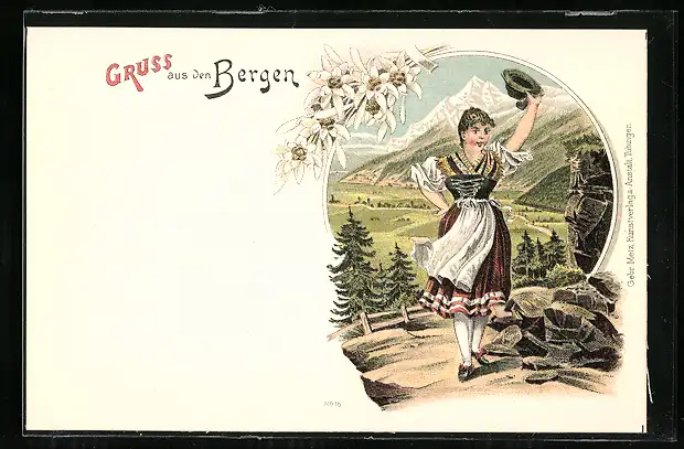 Lithographie Bergsteigen, Frau in Tracht winkt mit Hut