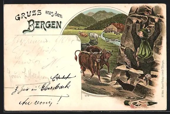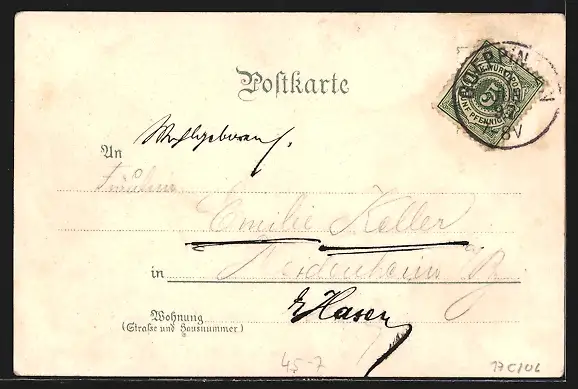 Personenbezogene Daten auf der Rückseite der Karte wurden durch blauen Textmarker unkenntlich gemacht. Die blauen Stellen sind auf die Vorderseite durchgeweicht und wirken sich negativ auf das Postkartenfoto aus