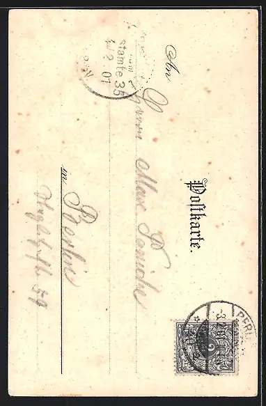 Personenbezogene Daten auf der Rückseite der Karte wurden durch blauen Textmarker unkenntlich gemacht. Die blauen Stellen sind auf die Vorderseite durchgeweicht und wirken sich negativ auf das Postkartenfoto aus