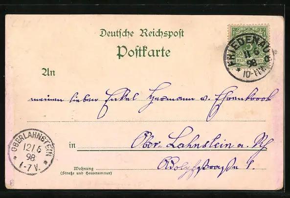 Personenbezogene Daten auf der Rückseite der Karte wurden durch blauen Textmarker unkenntlich gemacht. Die blauen Stellen sind auf die Vorderseite durchgeweicht und wirken sich negativ auf das Postkartenfoto aus