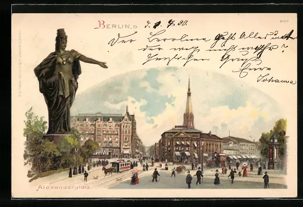 Lithographie Berlin, Alexanderplatz, Strassenbahn und Kutsche