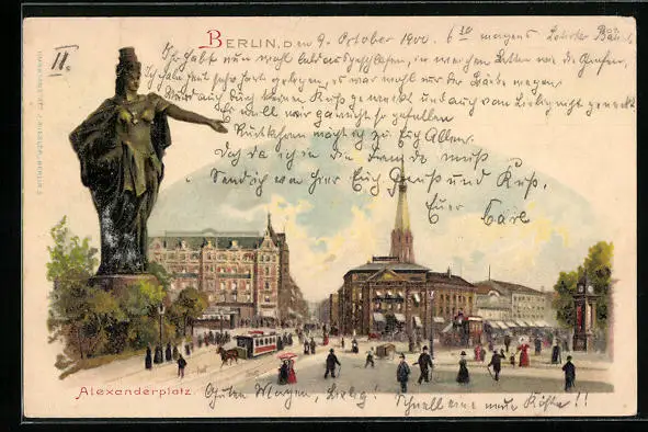 Lithographie Berlin, Alexanderplatz mit Pferdebahn und Passanten