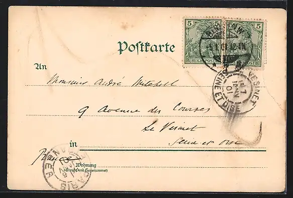 Personenbezogene Daten auf der Rückseite der Karte wurden durch blauen Textmarker unkenntlich gemacht. Die blauen Stellen sind auf die Vorderseite durchgeweicht und wirken sich negativ auf das Postkartenfoto aus
