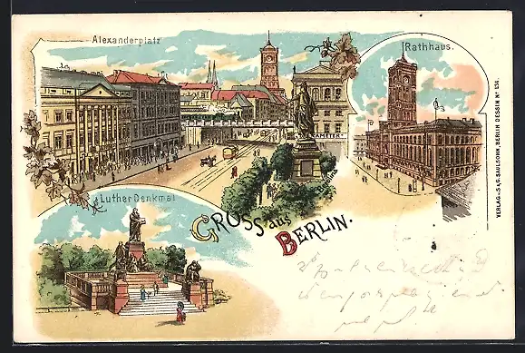 Lithographie Berlin, Ansicht vom Alexanderplatz mit Berolina, Rathaus, Luther-Denkmal