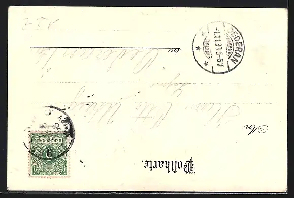 Personenbezogene Daten auf der Rückseite der Karte wurden durch blauen Textmarker unkenntlich gemacht. Die blauen Stellen sind auf die Vorderseite durchgeweicht und wirken sich negativ auf das Postkartenfoto aus