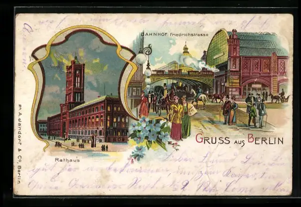 Lithographie Berlin, Bahnhof Friedrichstrasse, Rotes Rathaus