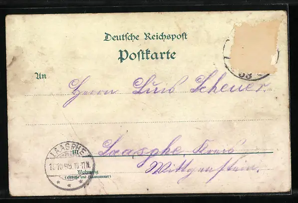 gelaufen 1899, Briefmarke entfernt, rückseitig Oberflächenschaden, Bugspuren unten re., guter Zustand