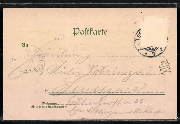 Personenbezogene Daten auf der Rückseite der Karte wurden durch blauen Textmarker unkenntlich gemacht. Die blauen Stellen sind auf die Vorderseite durchgeweicht und wirken sich negativ auf das Postkartenfoto aus