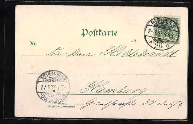 Personenbezogene Daten auf der Rückseite der Karte wurden durch blauen Textmarker unkenntlich gemacht. Die blauen Stellen sind auf die Vorderseite durchgeweicht und wirken sich negativ auf das Postkartenfoto aus