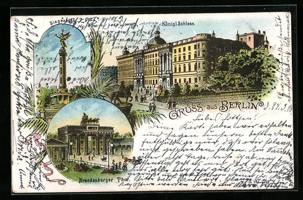 Lithographie Berlin, Brandenburger Thor, Siegessäule, Königl. Schloss