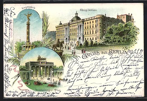 Lithographie Berlin, Brandenburger Thor, Siegessäule, Schloss