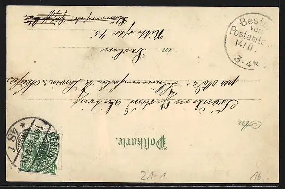 Personenbezogene Daten auf der Rückseite der Karte wurden durch blauen Textmarker unkenntlich gemacht. Die blauen Stellen sind auf die Vorderseite durchgeweicht und wirken sich negativ auf das Postkartenfoto aus