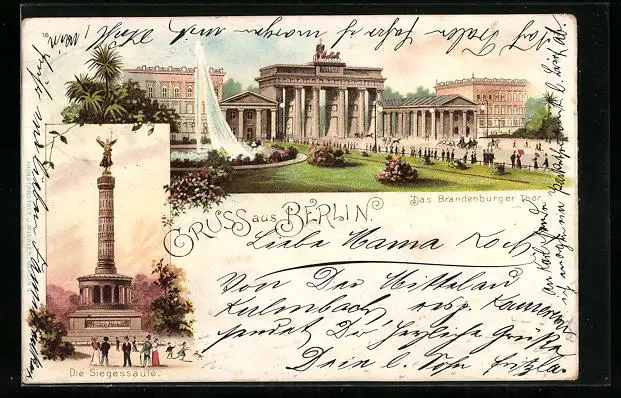 Lithographie Berlin, Brandenburger Tor, Siegessäule