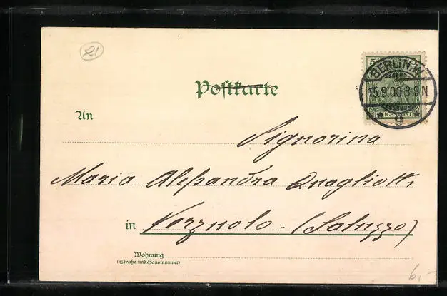 Personenbezogene Daten auf der Rückseite der Karte wurden durch blauen Textmarker unkenntlich gemacht. Die blauen Stellen sind auf die Vorderseite durchgeweicht und wirken sich negativ auf das Postkartenfoto aus