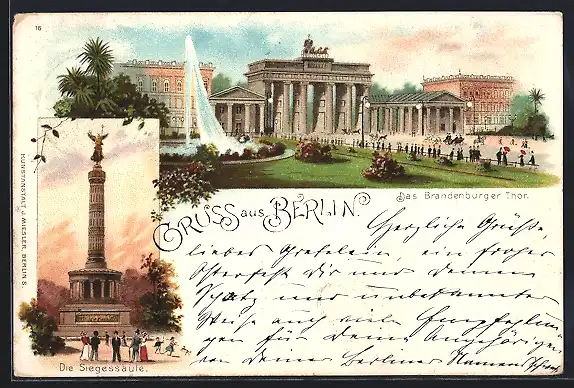 Lithographie Berlin, Brandenburger Tor und Siegessäule
