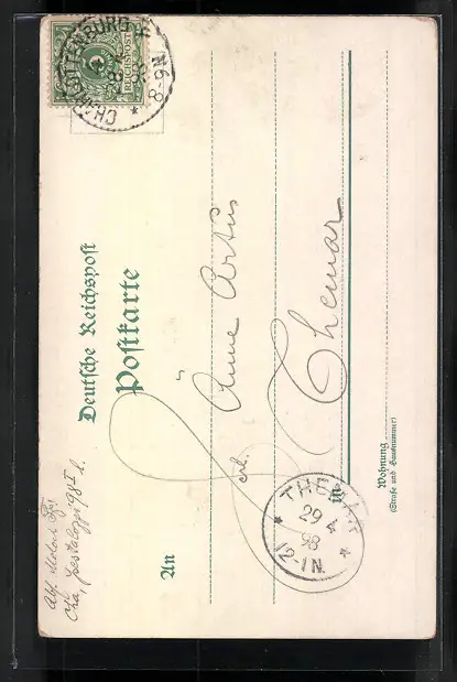Personenbezogene Daten auf der Rückseite der Karte wurden durch blauen Textmarker unkenntlich gemacht. Die blauen Stellen sind auf die Vorderseite durchgeweicht und wirken sich negativ auf das Postkartenfoto aus