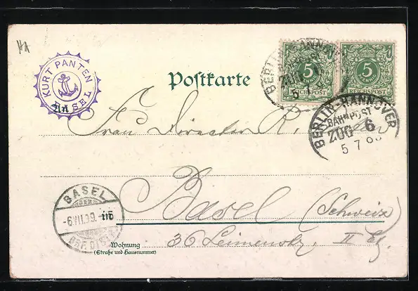 Personenbezogene Daten auf der Rückseite der Karte wurden durch blauen Textmarker unkenntlich gemacht. Die blauen Stellen sind auf die Vorderseite durchgeweicht und wirken sich negativ auf das Postkartenfoto aus